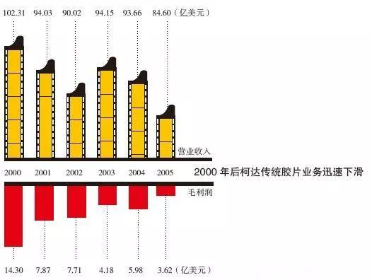 2000年以後,數碼技術促使了很多行業變革,數碼相機也得到了普及,佳能、尼康等日產照相機品牌抓住了這一時機,大規模地開發一系列的新機型。可是柯達依然一意孤行,執意投入在膠卷生產上,錯過了數碼技術這個風口。